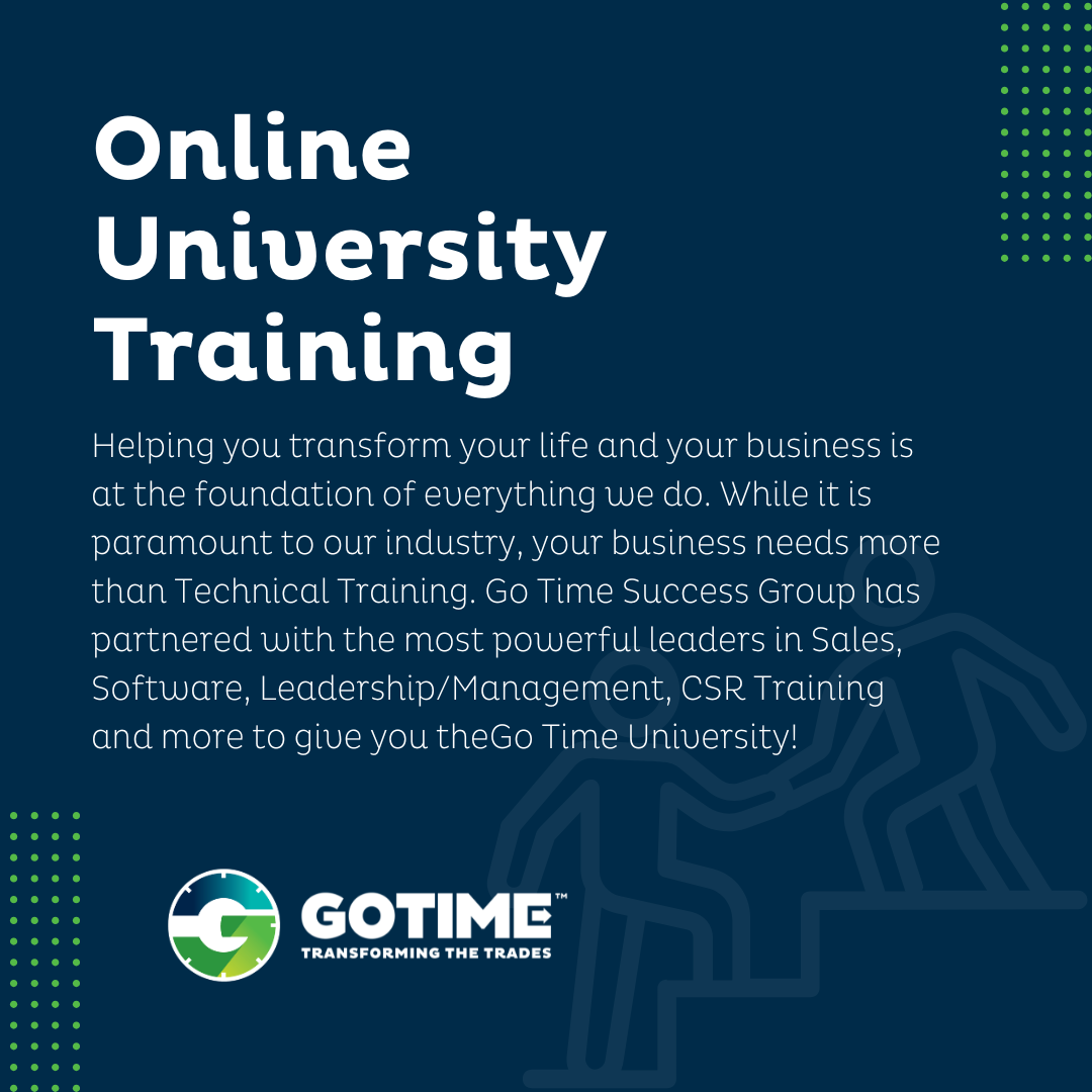 Bring expert HVAC training and leadership development straight to your team wherever they are. Go Time’s online training equips technicians and leaders with practical skills, proven strategies, and real-world confidence to boost performance, increase productivity, and drive results. Learn from industry pros with flexible virtual sessions designed for today’s home-service professionals